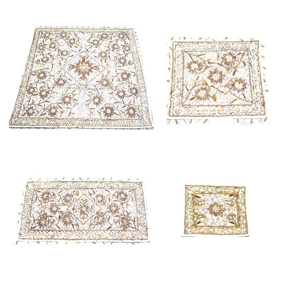 These textile madeups include handicrafts, table covers, mats and napkins. They have enchanting floral pattern. They have drops in matching color on edges.