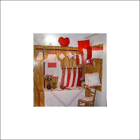 The set consists of pillowcases, cushion covers, tablecloths, towels, an apron, napkins, etc
