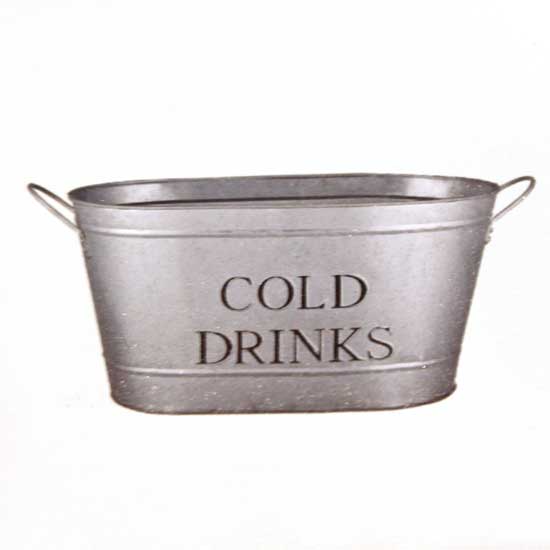 This is a metal ice bucket designed in a vintage style. The surface features embossed words with a nostalgic touch. The long shape provides sufficient space for multiple bottles.