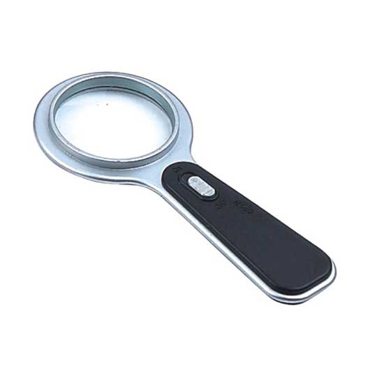 Shown here is a handheld magnifier boasting a simple yet practical design. The magnifier is equipped with a light for enhanced convenience. The metal frame and handle ensure durable use of the magnifier.