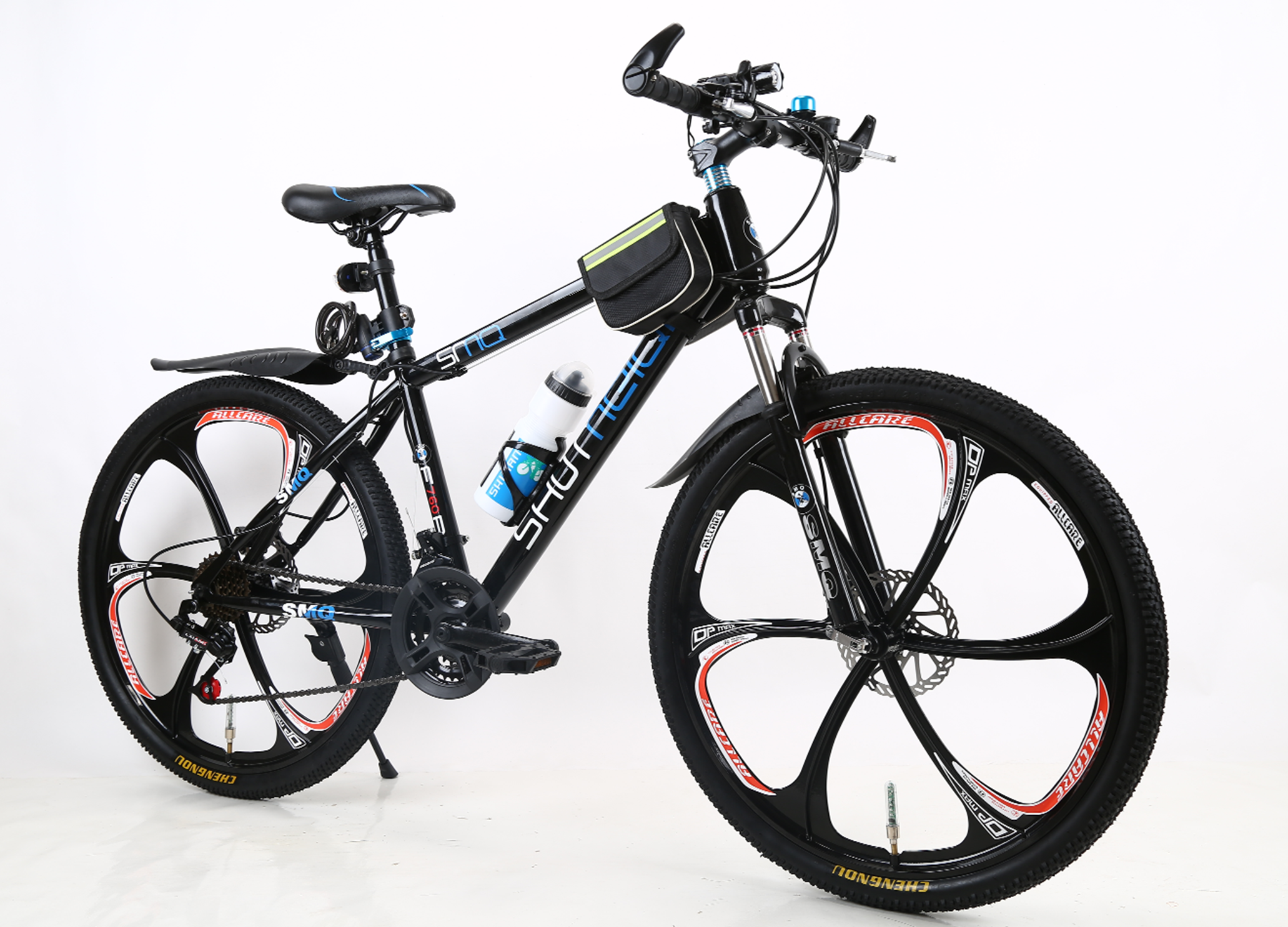 26-inch high carbon steel hard frame, spray-painted inner sticker, front shock absorber, dual disc brakes, magnesium alloy six blades, domestic transmission system (30 finger derailleur and 50 rear derailleur), Hengqi/Huanyu/Jusheng 26×195 tires, lengthened Meizui natural rubber inner tube