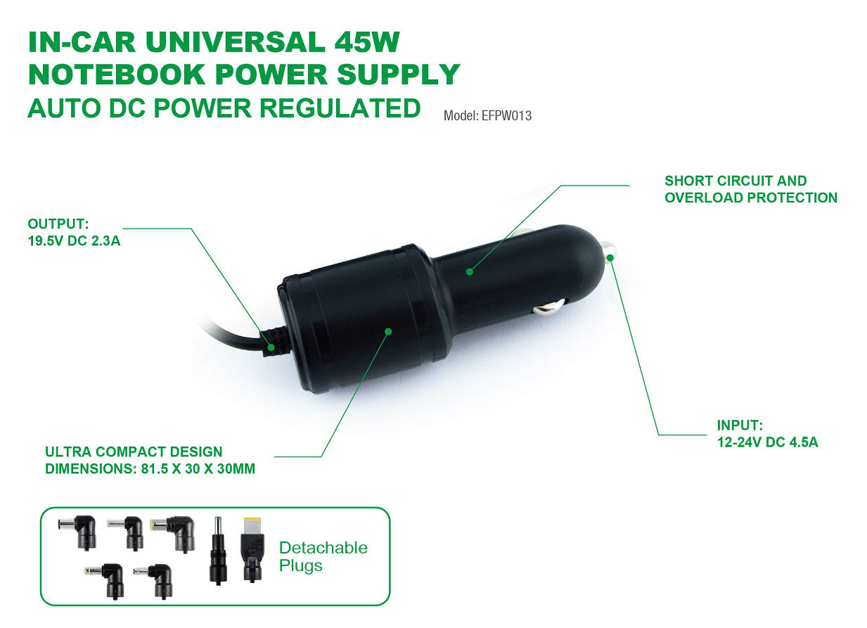 45W Car power Universal Notebook Charger with interchangeable plugs