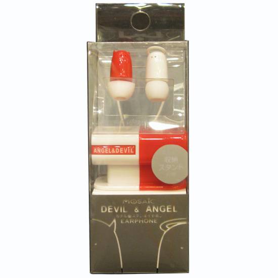 Featured are in-ear earphones with a theme of an angel and a devil. The closed-type earphone structure delivers deep bass sound. These dynamic earphones are the ideal choice to use with all your audio players.