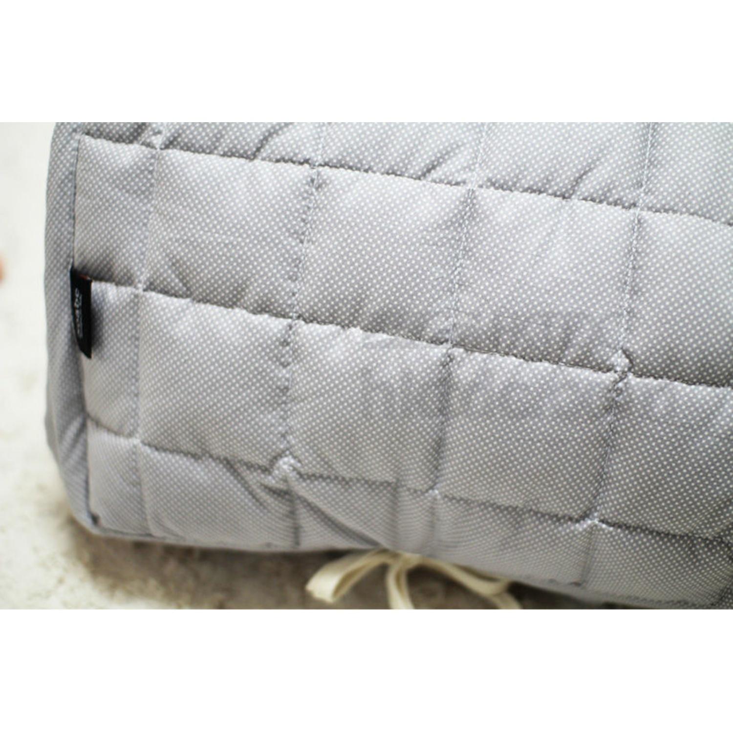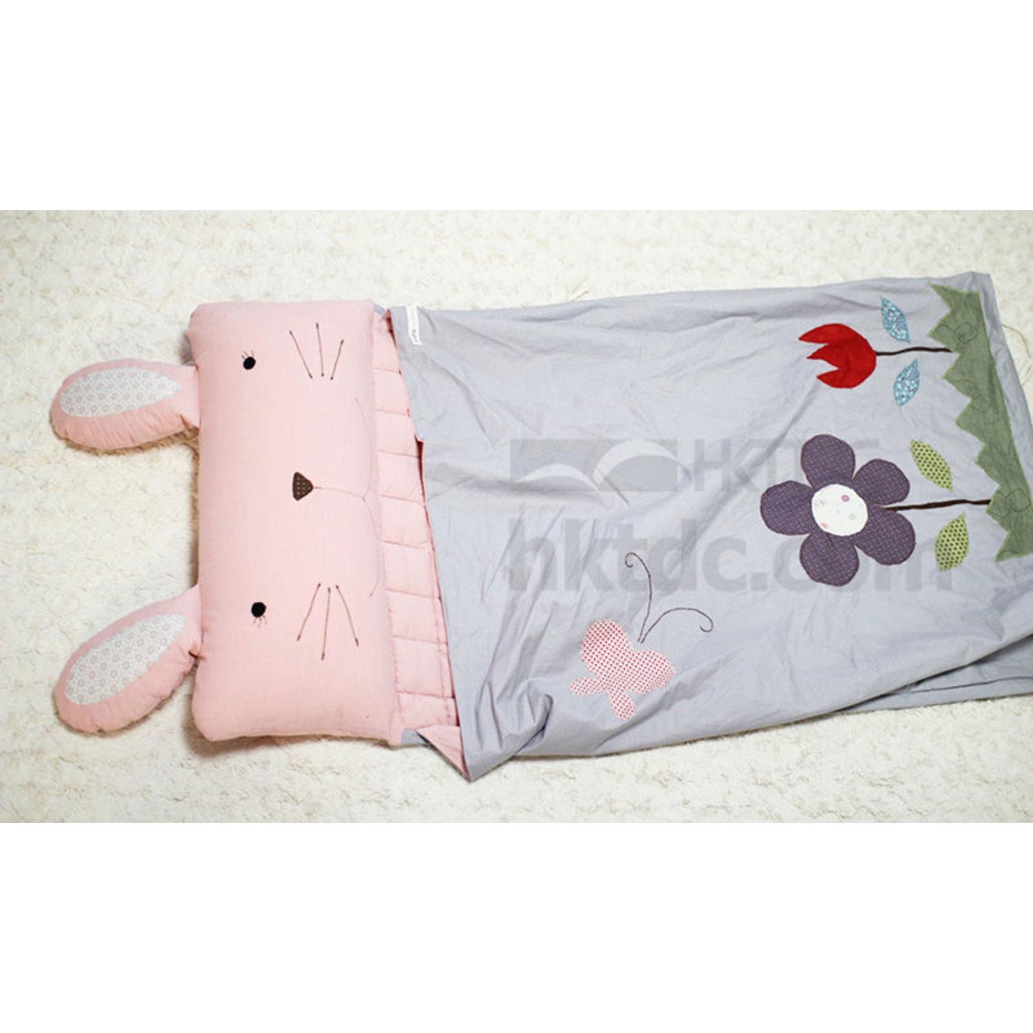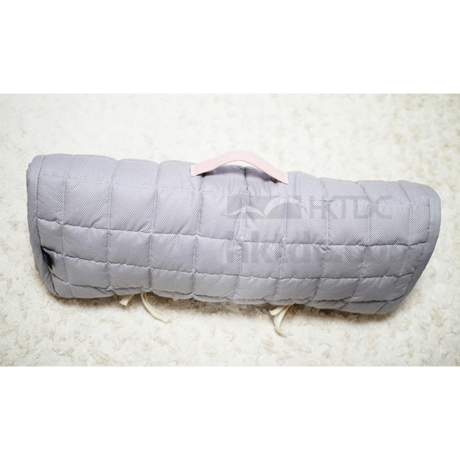 It is a comfy nap mat decorated with pink rabbit pillow and grey dot-patterned fabric.
