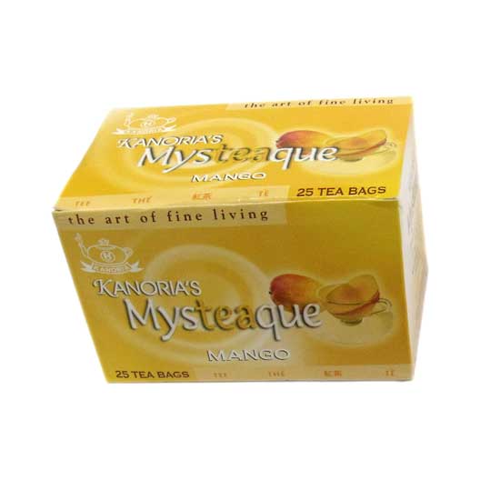 Showcased is a box of Indian herbal tea that comes with a mango flavor. The tea leaves are dried and fried for a fruity aroma. This astringent aftertaste makes this herbal tea perfect to drink in summer.