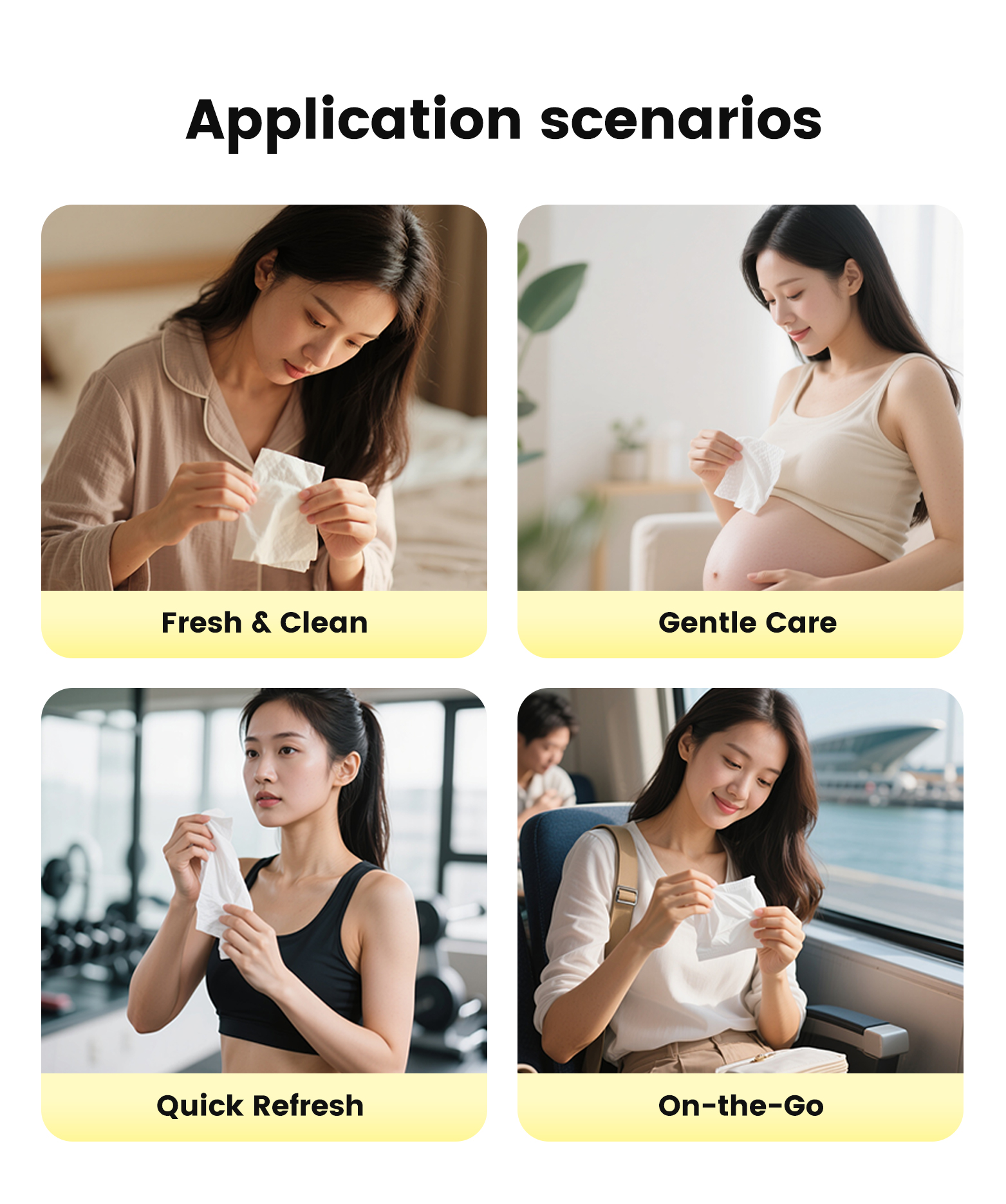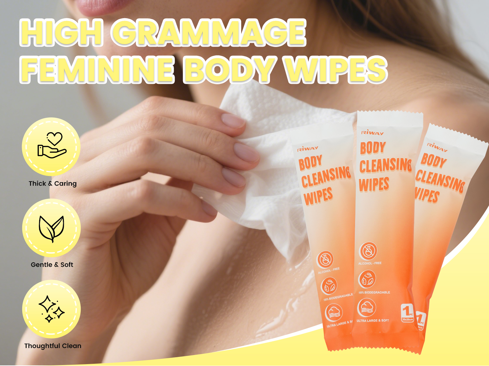 | Experience the ultimate refreshment with our high-grammage body wipes, specifically designed for a woman's delicate skin. These extra-thick, oversized wipes offer a luxurious, shower-like clean when you're on the go—perfect for post-workout, travel, or quick midday refreshes. |