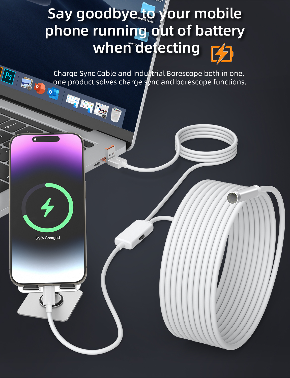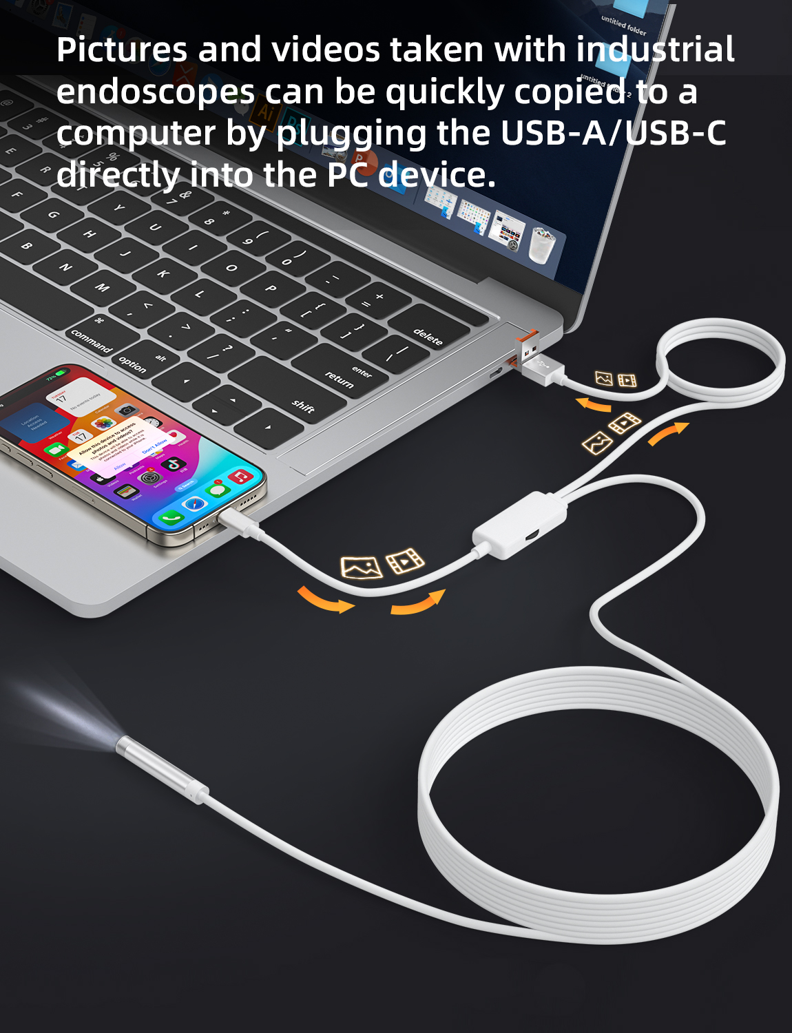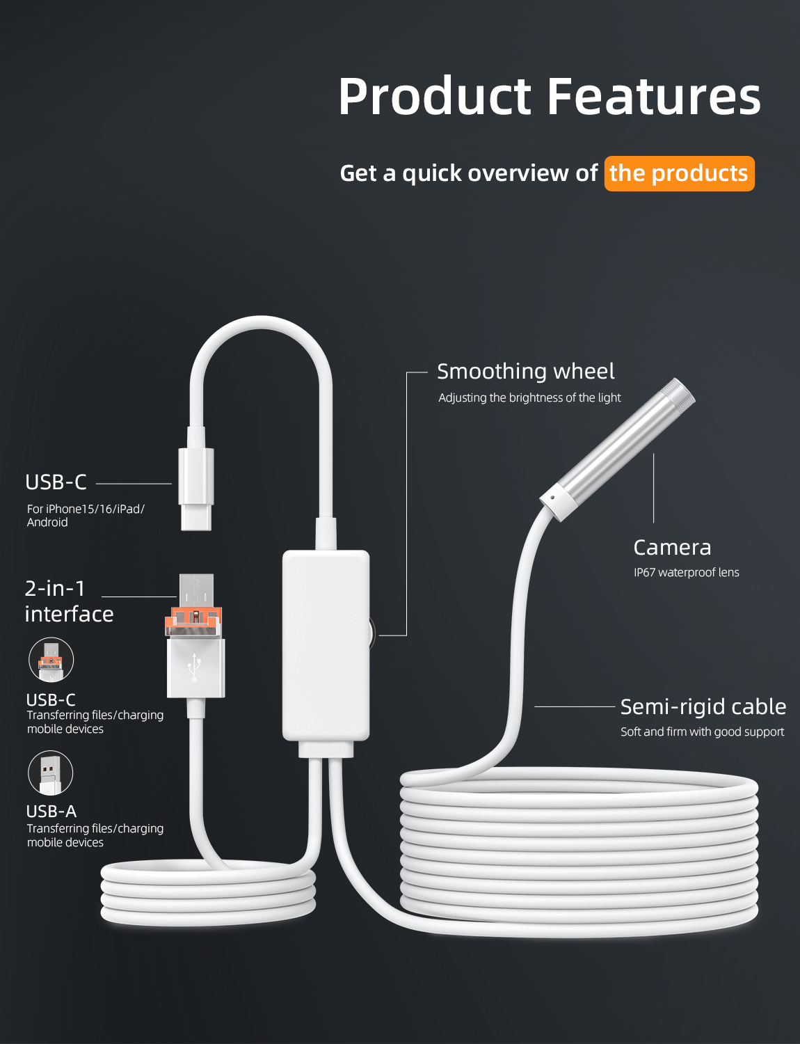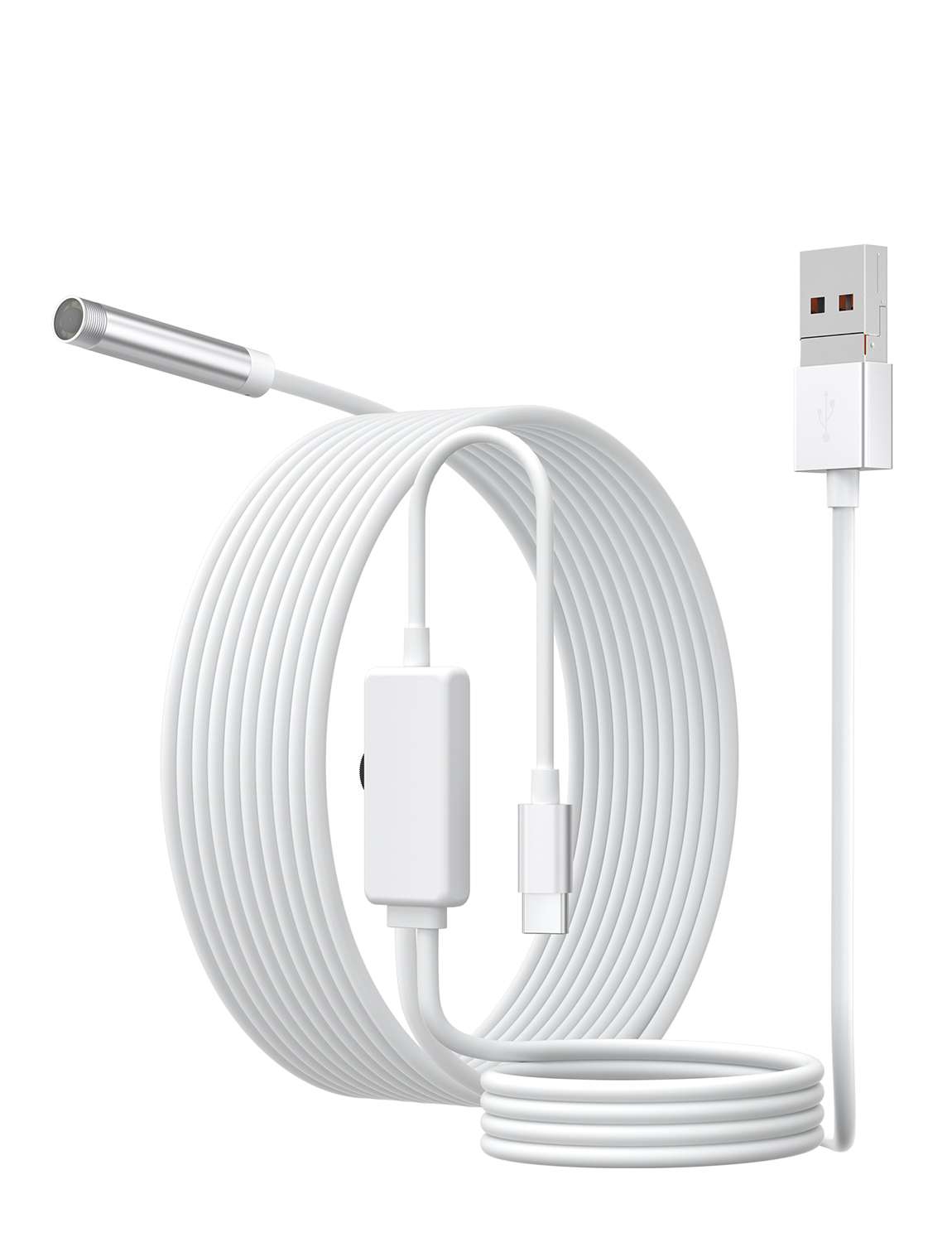 As a professional digital accessories provider, ZOIOT presents this 2-in-1 industrial endoscope with charging & data sync cable, designed for versatile inspection needs. Featuring a 2-in-1 USB-A/USB-C interface, it supports plug-and-play across iPhone 15/16, iPad, Android, and PC systems, enabling simultaneous device charging, file transfer, and endoscopic inspection. Equipped with an IP67 waterproof 8mm lens, 1920×1080P HD resolution, and 8 adjustable LED lights, it delivers clear visuals in wet/dusty environments. The semi-rigid 5m cable ensures flexible navigation into narrow spaces, while its compact white design offers portability and easy identification—ideal for plumbing, automotive repair, and industrial maintenance.