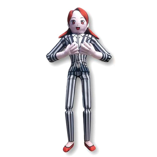 This air-injected mannequin features a woman in a striped suit. The mannequin is great for promotional and advertising uses. It is made of quality material and can be reused many times.