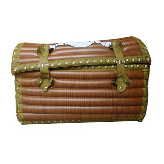 This inflatable toy features the shape of a pirate's treasure chest. Its detailed design comes with realistic wood patterns. This toy is suitable for use in role-play games.