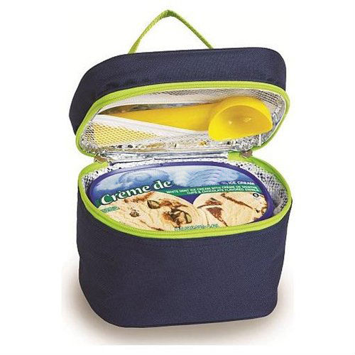 Featured here is an insulated cooler bag for keeping ice cream cool. It has a fully insulated thermal foil lining and can hold 1.5 quart or pint ice cream containers. This cooler bag has a handle on top for carrying and comes with an ice cream scoop and reusable freezer ice packs.