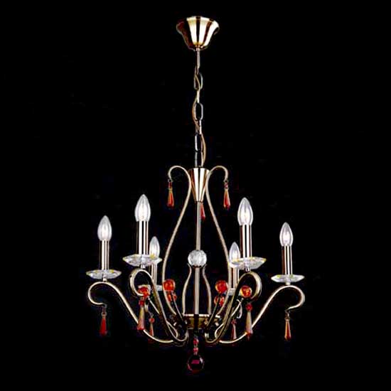 This chandelier features antique brass colored iron arms for a unique touch. The draping Chinese crystals accentuate the light easily. This distinctive chandelier is equipped with 6 candle lights.