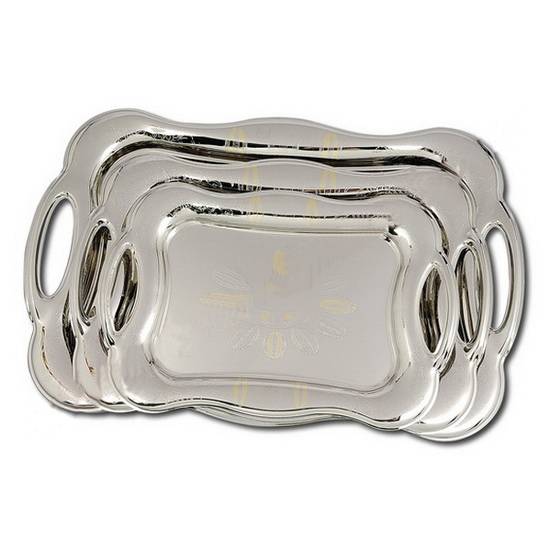 This is an iron nickel plated tray set with lasted design and genuine golden pattern. It includes three different sizes trays. All of them have handles on both sides.