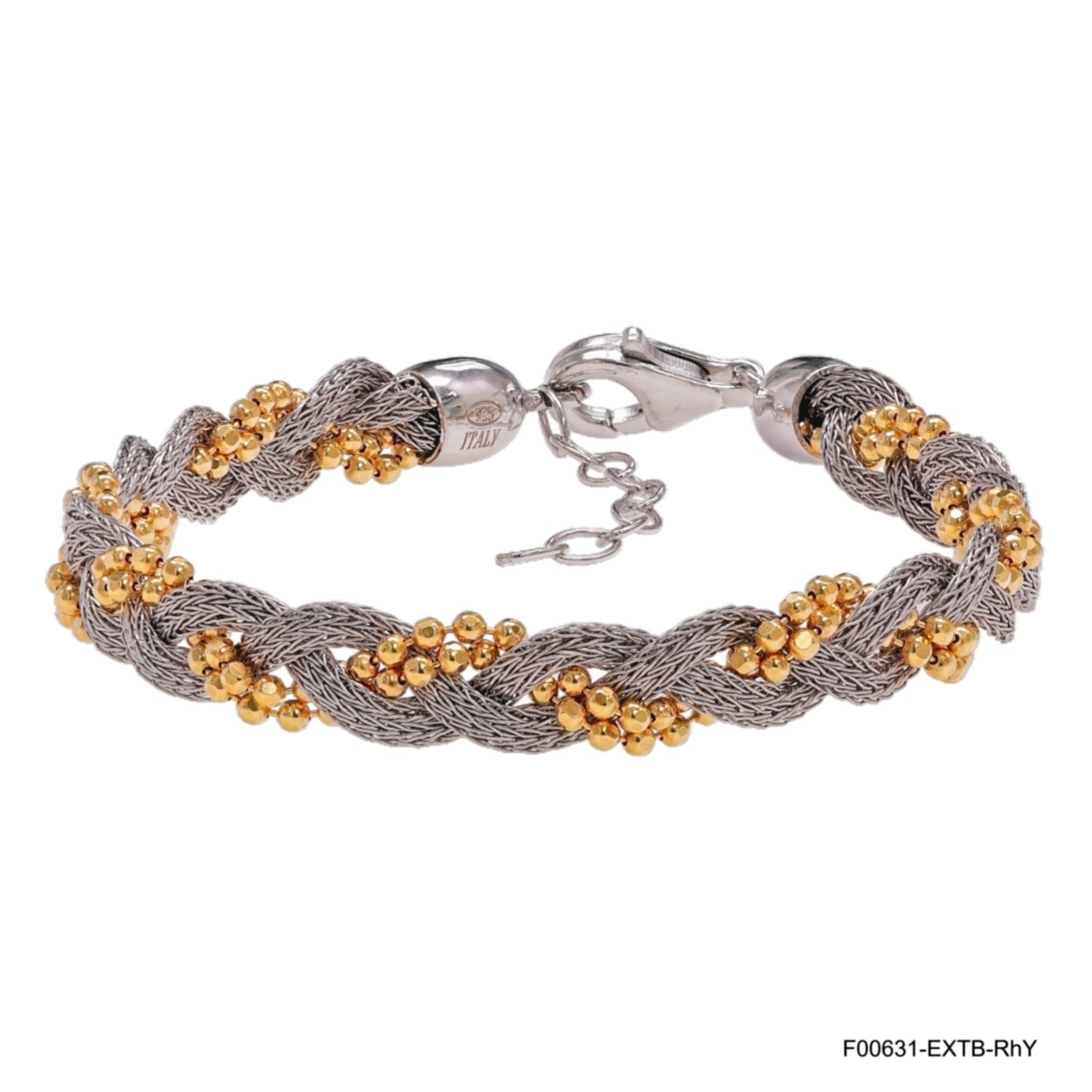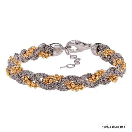 Expertly woven in Italy, this bracelet features a sophisticated braided chain of rhodium-plated sterling silver, punctuated by clusters of polished yellow gold-plated beads. The intricate weave and contrasting tones create a rich, tactile texture that catches light with every movement, adding subtle dimension to your wrist stack.