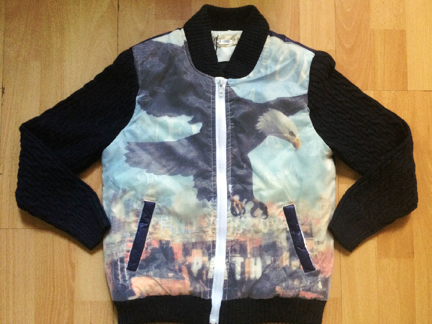 This is a fashionable and animal design jacket. The sleeves are sweater, front is print covered with Organza. It comes stylish.