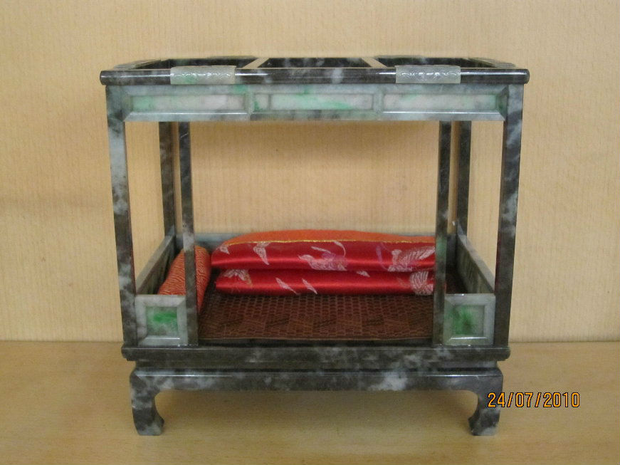This design is inspired by Chinese antique emperorial beds. The base is made with a fundamental tone of black jade, along with rectangular decoration made of greenish purple jade.