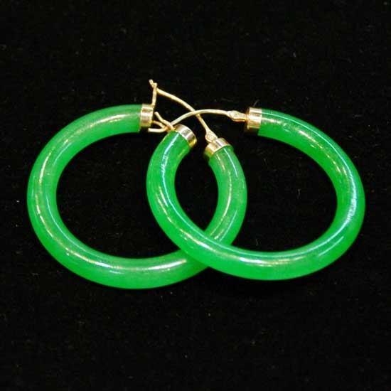 This pair of exquisite earrings features a hoop of translucent jade, shining in a clear green shade with excellent luster. The hoop goes with a 14K gold clasp, which the golden hue perfectly matches the lustrous jade. The pair of jade hoop earrings ensures convenience in an elegant way.