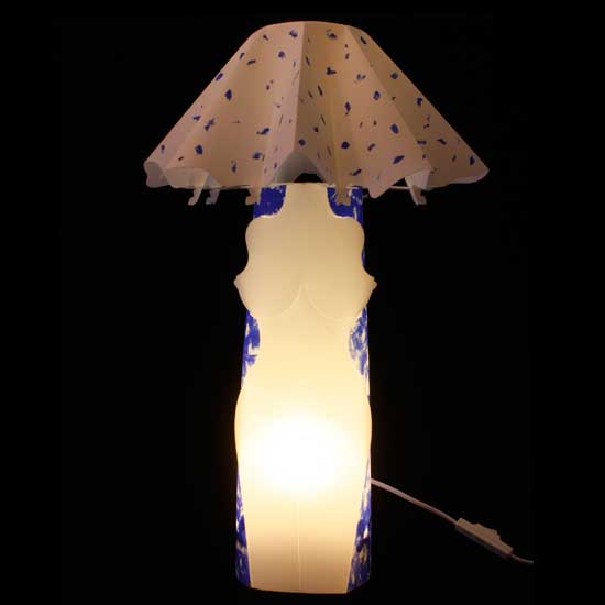 Displayed is a lamp with a base that well portraits a curvy feminine figure. The figure gives sheer and sensational luminance when lighted. This arty piece makes a great decorative piece for that corner of your bedroom.