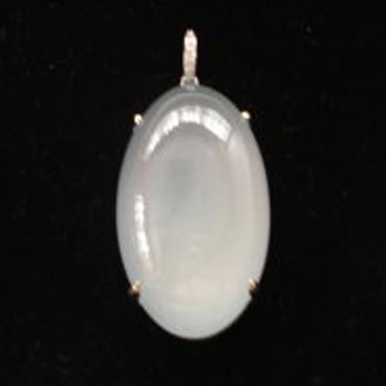 This is a jade pendant made of an oval shaped icy jade of cabochon cut. The jade is supported by 4 silver prongs and is mounted on 18K white gold.