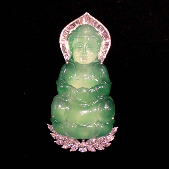 This is a jade pendant featuring the Goddess of Mercy. The pendant boasts exquisite carved details and is set with pink diamonds, showcasing a touch of sophisticated glamor. Complement your fine jewelry collection with this pretty jade pendant.