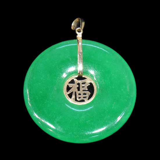 This attractive pendant features a round loop jade with a gold Chinese character “Fu” in the center. It is finely crafted to ensure a glossy and natural look. This blessing pendant is suitable for daily wear.