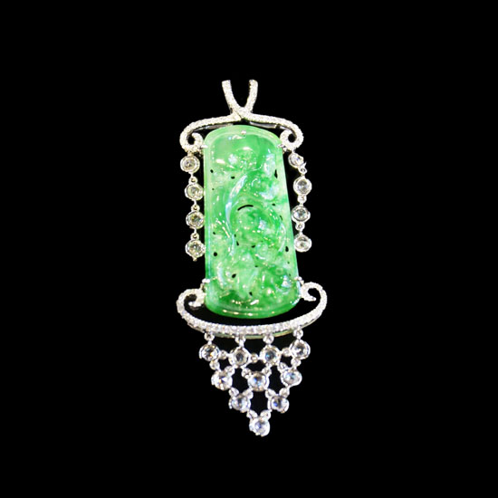 This is a charming pendant that comes with excellent craftsmanship. It features a large jade gemstone in natural green for a lustrous look. The dazzling diamonds add a touch of luxuriousness to the whole piece.