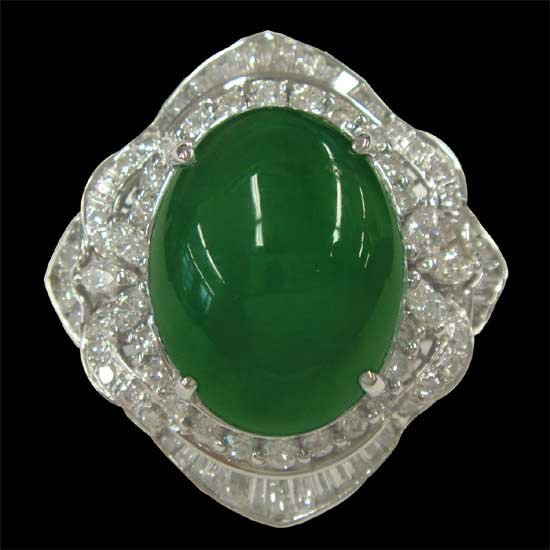 This beautiful ring is crafted with a 14ct oval jade in platinum 900. Surrounded by 1.82ct diamond setting, the oval jade boasts immaculate polish and smoothness. This ravishingly gorgeous jade ring is a magnificent addition for fine jewelry collectors.