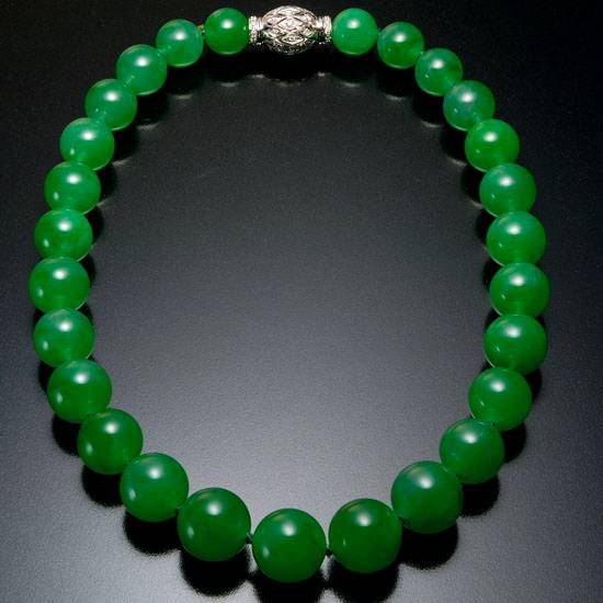 This is a single-strand necklace composed of 27 pieces of emerald green jadeite beads. The emerald green jadeite cabochons are translucent and finely cut. The necklace is fastened by a 18K white gold diamond clasp which is durable and fashionable.