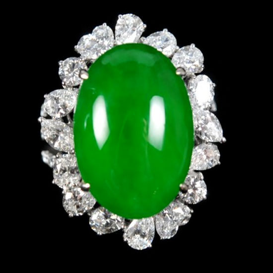 This spectacular jadeite ring presents a rich, full, luscious emerald color. The perfect oval jadeite is surrounded sparkling stones of different shapes. This well-crafted jadeite ring lends an exquisite flair to the wearer.