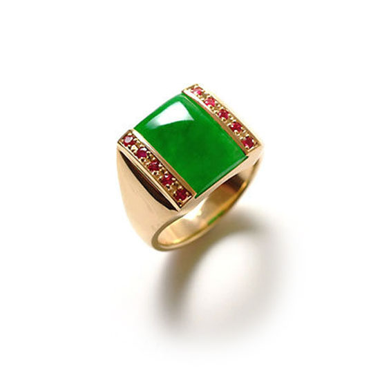 This jadeite and ruby ring is carved into a square shape for a modest glamour. The brilliant green and red colors will draw anyone's attention. This exceptional ring is simple but sophisticated.