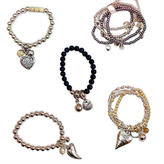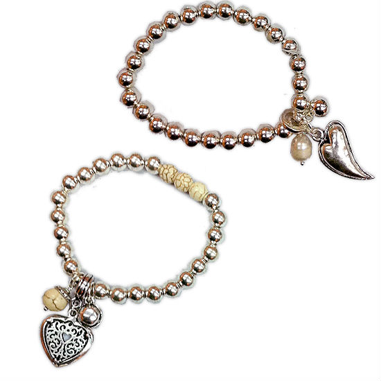 - Alloy plated charms with designs of heart, bead, plate, and more.
