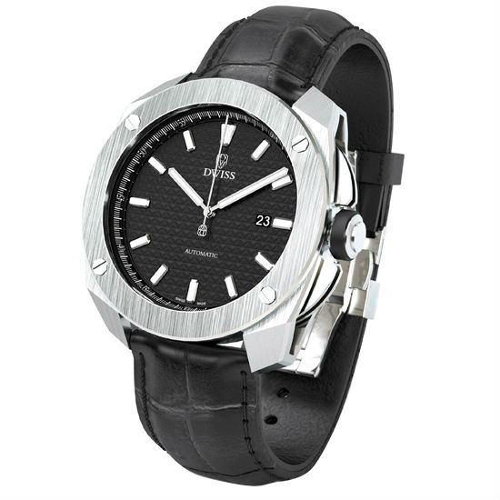 Automatic Swiss made watch with a creative and patented construction, see trough lugs in 6 different SKUs to fulfill your need of sport-classic and stylish timepiece. Material: stainless steel 316L (case), rubber and sapphire crystal with double anti-reflection Swiss made. Mechanical Automatic Swiss movement Caliber 2824-2 Round IP black bezel, black rubber strap and screw down crown. Water resistance: 10 ATM. 3-hand construction on the analog display. With a date display window and minutes numeral markings. Exclusive patented design.