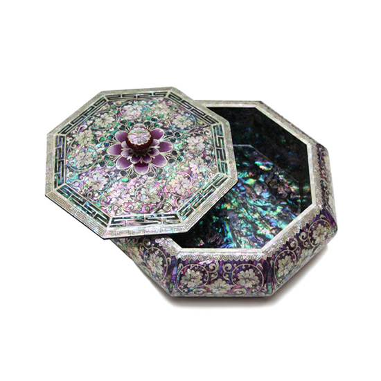 This is a jewelry box with a stunning and deluxe design in an octagonal shape. Its interior and exterior are crafted with beautiful nacre for added charm. The sophisticated flower patterns on the exterior appeal to people instantly.