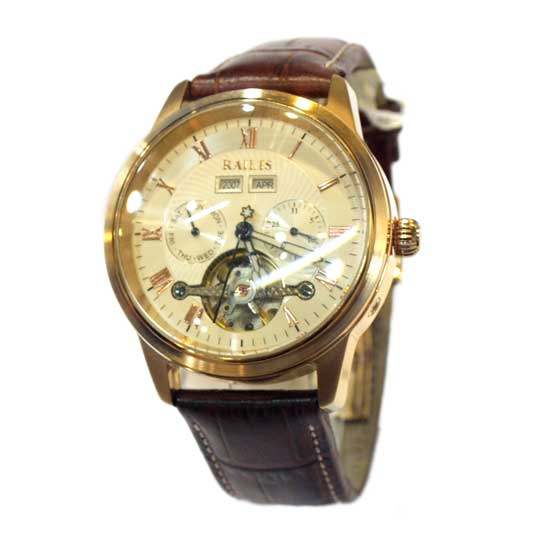 This automatic watch features a round dial with embossed Roman numerals for an exquisite touch. The skeleton part boasts a stylish design. The comprehensive year, month, date and day of the week display offers exceptional convenience to the wearer.