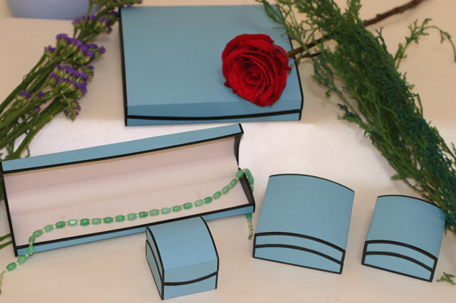Plastic jewellery box covered with blue paper, black edge, white PU inside.