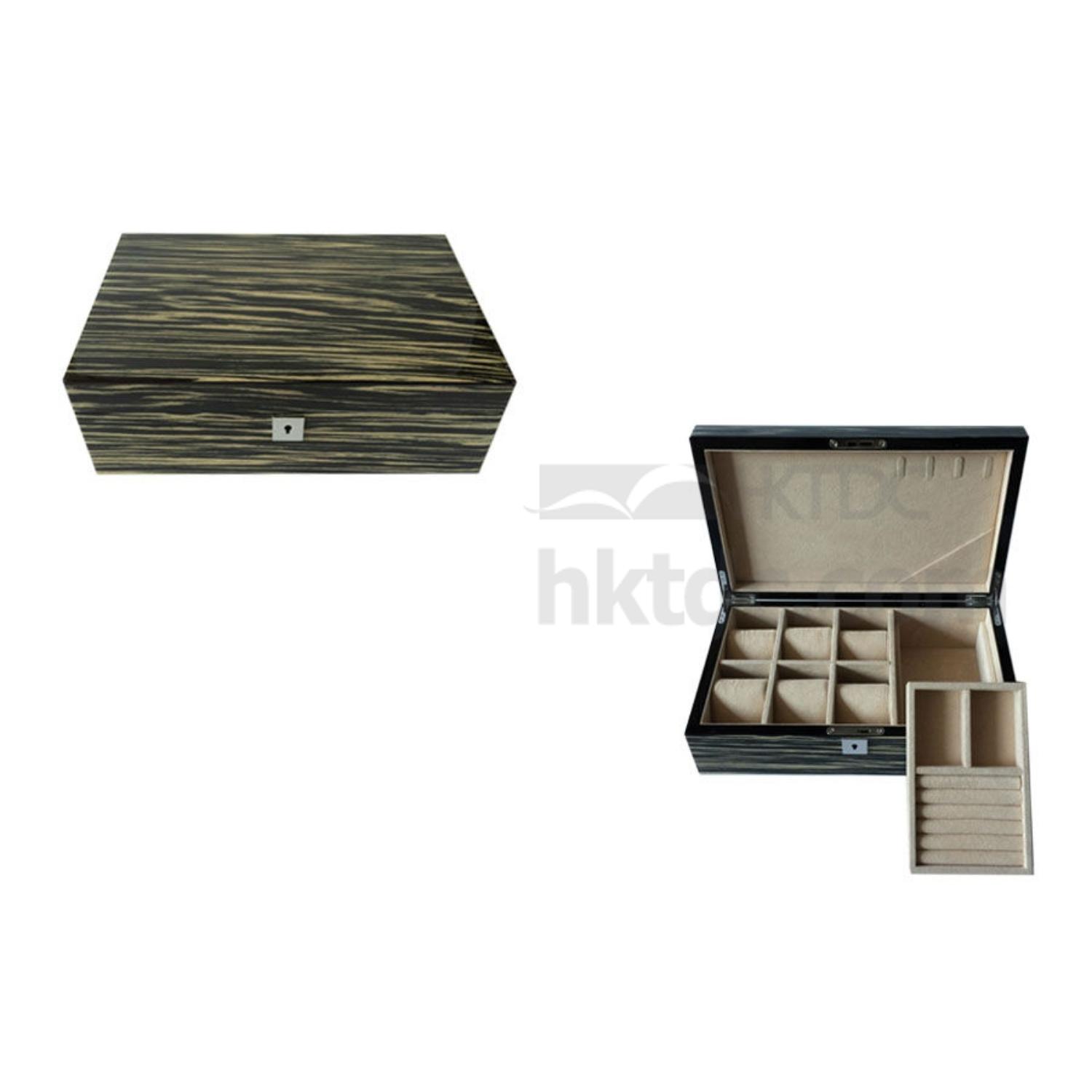 Materials:Outside is MDF with wood veneer put high gloss lacquered,Inside used fabric for jewerllery and watch.