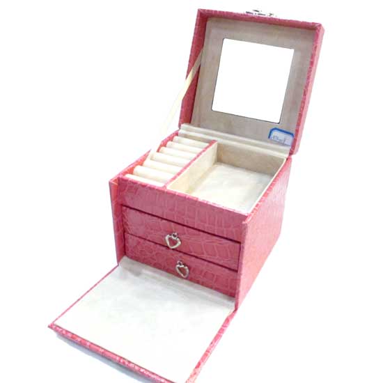 This is a jewelry box with a sophisticated and dainty design with a pink exterior. It comes with multiple drawers and individual compartments for storing all kinds of jewelry. The box comes with a square mirror on the cover for added convenience.