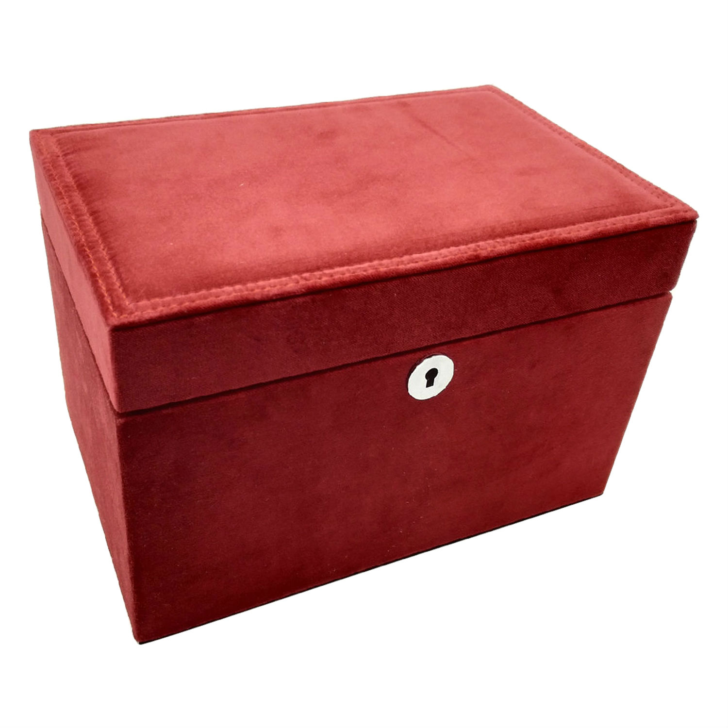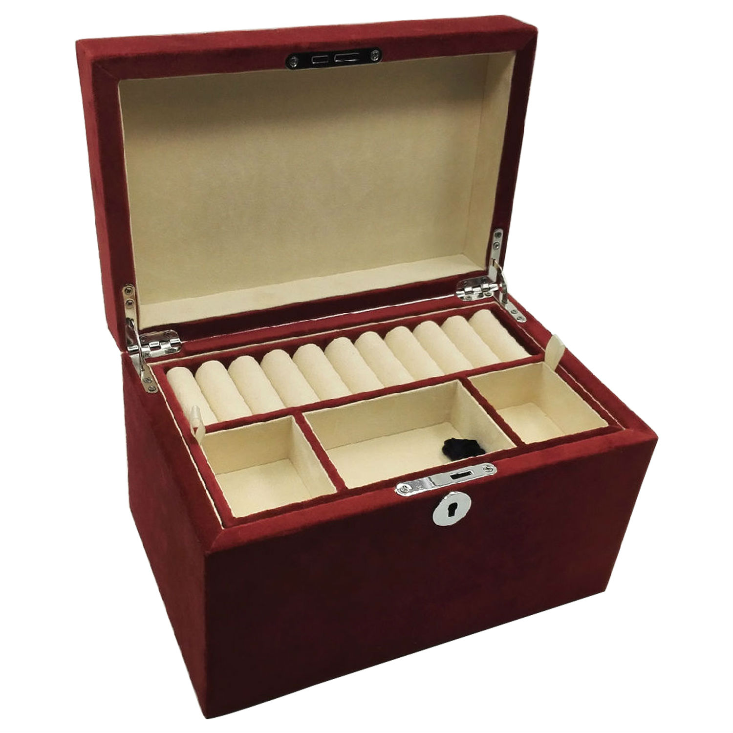 This jewelry box boasts a generous interior to offer maximum storage for all your jewelry. The removable top features multiple compartments for rings, bracelets, necklaces and other dainty accessories. This velvet jewelry box allows you to neatly store and organize your jewelry.