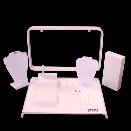 The jewelry display impresses you with its elegant design. Assorted matching holders are included for displaying your jewelry collection. The rugged construction ensures years of reuse.