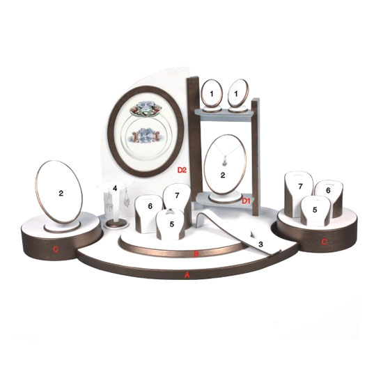 As shown is a jewelry display set with a comprehensive design. This whole set features an elegant white layout with matching bronze trims. This set will project the beauty and glamor of your precious jewelry.