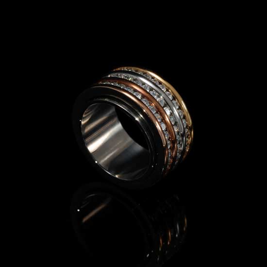 The ladies' jewelry ring features a three-tone band of silver, yellow gold and rose gold. It is adorned with round stones for a glamorous look. Show off your style with this stone-encrusted jewelry ring.