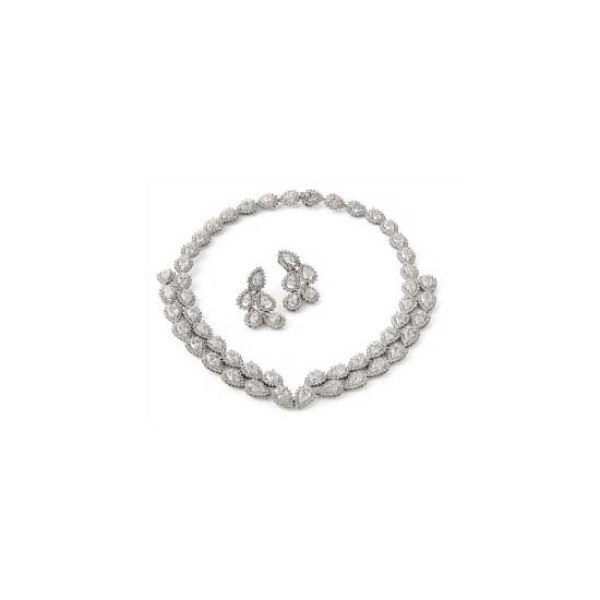 The stunning jewelry set comes with a pair of earrings and a necklace, featuring leaf-like charms embedded with silvery glittering stones. The leaf-like charms are too densely packed to leave any space for chain and links exposure, the jewelry set simply gives dazzling shine to the fullest.