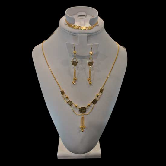 Featured is a set of jewelry that includes a bangle, a necklace and a matching pair of earrings. The items are finely crafted with pure gold from 9K to 22K. The coin-shaped adornments bring an elegant and nostalgic vibe to the pieces.