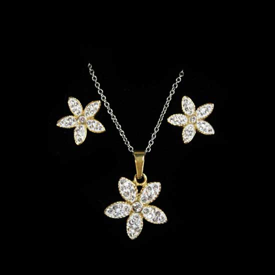 This is a set of trendy jewelry that includes a finger ring, a pair of earrings and necklace. Each piece boasts a flower design with sparkling crystal decorations. With excellent craftsmanship, this set makes an ideal addition to your jewelry collection.