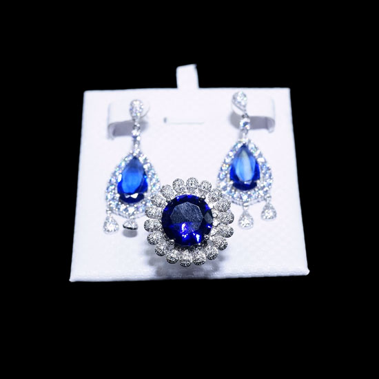 This is a jewelry set featuring blue CZ stones. The earrings are designed with pear-shaped dangles for a dynamic style while the ring showcases a large centerpiece surrounded by sparkling elements. This beautiful jewelry set is great for accessorizing evening dresses.