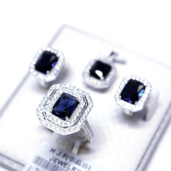 This is a set of jewelry that comes with a finger ring, a pendant and a pair of earrings. Each piece features a silver mounting with a polygonal embellishment. The embellishment comes with a blue emerald-cut CZ stone centerpiece which is encircled with two lines of white stone elements.