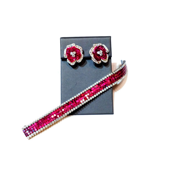 This is a jewelry set that comes with a pair of earring and a bracelet. The earrings are designed with a vivid and beautiful flower appearance. The sparkling diamond and ruby elements accent this design for a touch of luxuriousness and uniqueness.