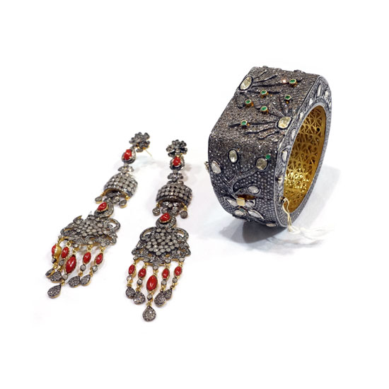 This is a jewelry set that comes with a pair of earrings and a bangle. The earrings boast n charming and sophisticated design with sparkling diamond elements and red coral accents. The bangle is also adorned with shimmering diamond elements for added style.