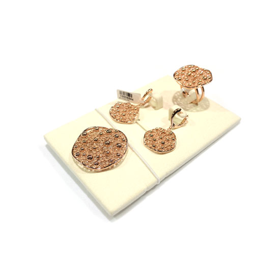 This is a stylish jewelry set that includes a pair of earrings, a pendant and a finger ring. The allover dazzling stones add a touch of style to all the pieces. This jewelry set is made of 18-karat rose gold and shimmers with a high-gloss finish.