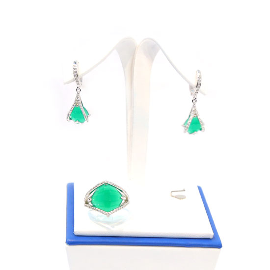 This jewelry set is composed of a pair of drape earrings and a finger ring. The earrings and ring feature agates in a seafoam-green color. Embellished with shimmery CZ stones, the jewelry items look even more gorgeous and feminine.