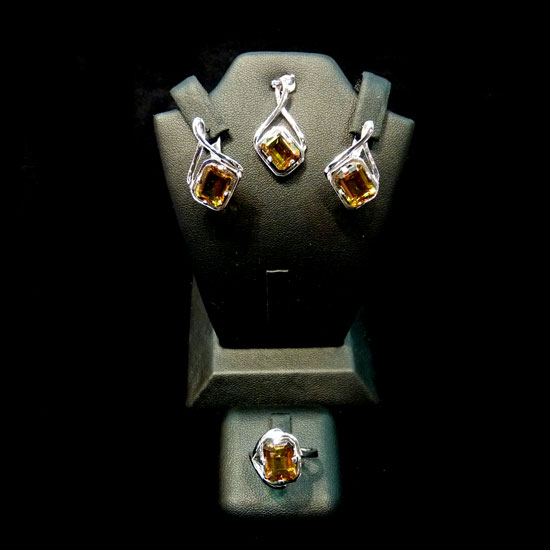 This jewelry set consists of a pair of earring, a pendant, and a ring. It is exquisitely carved from yellow zultanite and sterling silver. Present this jewelry set to your beloved at Valentine's Day or other special occasions.